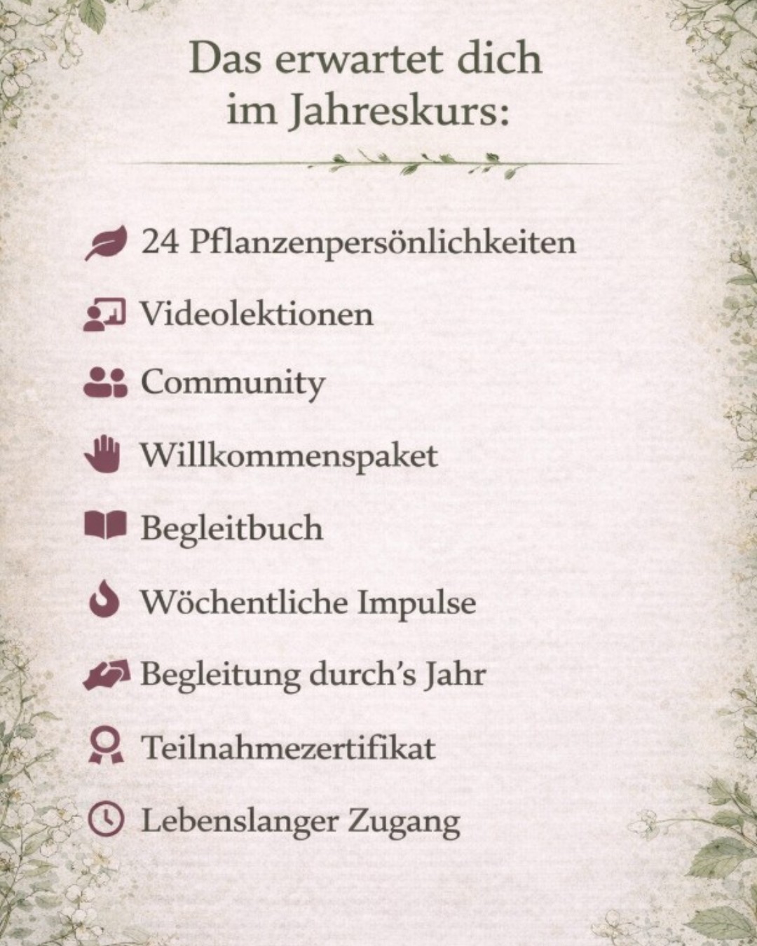 Es geht bald los! Ein ganzes Jahr gemeinsam Pflanzen entdecken Liebe Pflanzenfreunde, man fragt mich gelegentlich, warum ich überhaupt Bücher schreibe, warum ich mich mit Pflanzen beschäftige, warum ich gärtnere oder der Heilkunde der Naturvölker und unserer steinzeitlichen Vorfahren nachgehe? Nun, die Antwort ist einfach: Weil es mich interessiert! »Interesse« bedeutet ja wortwörtlich »mitten drin« (lat. inter) im »Wesentlichen« sein (lat. esse). Alles andere wäre Langeweile, Qual, Stumpfsinn. Unser wahres Interesse ist die Weisung der göttlichen Stimme in uns, die Stimme des Dharma, der geistigen Führung, die uns durch das Leben lotst. Also folge ich meinen Interessen und merke, dass damit mein Leben Sinn hat und Freude macht. Genau darum geht es mir auch in meinem Jahreskurs „Ein Jahr Pflanzenwissen“. Über ein Jahr hinweg tauchen wir tief in die Welt der Heilpflanzen, alten Überlieferungen und natürlichen Zusammenhänge ein. Es geht nicht nur um Theorie, sondern um gelebtes Wissen – um die direkte Erfahrung mit der Natur. Und ich hoffe, dass meine Videos und Impulse dazu beitragen, eine tiefere Resonanz in dir zu wecken und deine Wahrnehmung für die Lebendigkeit der Natur zu öffnen. Zur Info: Der Frühbucherrabatt gilt nur noch bis einschließlich morgen 01. Februar. Ab dem 2. Februar gilt der reguläre Preis für den Jahreskurs. 🐺🌱 Zum Jahreskurs Jede Videolektion beinhaltet eine Pflanze im detaillierten Porträt mitBestimmungsmerkmalen, ihrem Brauchtum und den kulturellen Hintergründen. Außerdem erfahrt ihr Heilanwendungen und eine Anleitung, wie ihr sie in Garten oder Balkon pflanzen könnt. Die Videos werden jede zweite Woche veröffentlicht und stehen euch lebenslang zur Verfügung. Heilkraft Lernt, wie ihr Pflanzenanwenden könnt undwelches Heilpotenzial inihnen steckt. Brauchtum Jede Pflanze hat einelange Geschichte zuerzählen. Entdeckt diealten Mythen und dasBrauchtum. Anwendungen Mit vielen Rezepturen derHeilkräuter als Tees,Tinkturen, Umschläge,und mehr. Damit du im Kurs nicht nur digital lernst, sondern dein Wissen auch praktisch anwenden kannst, schicken wir dir unser liebevoll zusammengestelltes Kurspaket direkt nach Hause. Neben einem praktischen Workbook mit Impulsen für deine Naturbeobachtung, kannst du mit dem Samen Set eigene Heilpflanzen anbauen und deine Erfahrungen in der kurseigenen Community teilen. Workbook Mappe Schreibset Samen-Set Preise und FrühbucherrabattMelde dich bis zum 1.2.2026 an, um eine Ersparnis von 160€ zu erhalten. Jetzt 740€ statt 900€ Jetzt anmelden Lasst uns gemeinsam auf eine Reise durch die Natur gehen, ” Die Seele kann genährt werden indem wir uns der Natur zuwenden und ihre Schönheit genießen Wolf-Dieter Storl