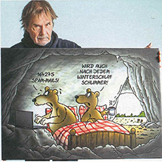 Versteigerung von Uli Steins Cartoons Unser treuer Unterstützer, Cartoonist Uli Stein, spendete uns zwei seiner Cartoons auf großen Leinwänden. Die Bilder wurden in den erfolgreichen Programmzeitschriften TV Hören und Sehen und TV14 versteigert. In beiden Ausgaben erschien ein langes Interview mit Uli Stein über seine Tierliebe und seine Arbeit für Animals Asia. Danke an Uli Stein und die Redaktion von TV Hören und Sehen und TV 14! |