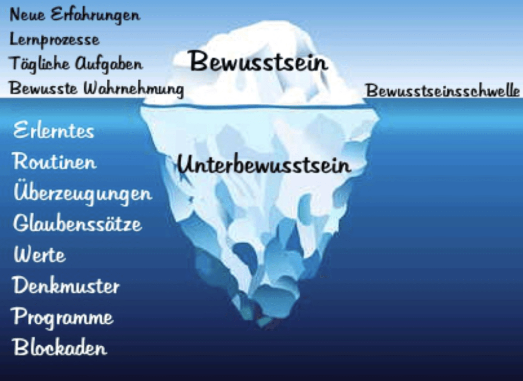 Das Unterbewusstsein ist dem unsichtbaren, im Wasser liegenden Teil eines Eisbergs vergleichbar. Einige glauben, dass bis zu 95% unserer geistig-seelischen Aktivität im Unterbewusstsein stattfindet, genau unterhalb unserer bewussten Wahrnehmung. Dieser „Unterwasser“-Teil des Bewusstseins ist jedoch nie untätig, da er andauernd Informationen sammelt und verarbeitet – selbst wenn wir schlafen.