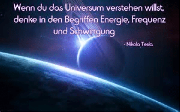 „Tesla prägte dieses schöne Sprichwort, das die hinduistische Philosophie sehr gut zusammenfasst, indem er sagte, „um die Geheimnisse des Universums zu verstehen, denke in den Begriffen Energie, Frequenz und Schwingung“. Denn alles besteht aus Energie, die mit ihrer eigenen Frequenz vibriert. Was wir glauben ist, dass wenn dein Unterbewusstsein mit Mustern gefüllt ist, die auf einer bestimmten Frequenz vibrieren, dass du Dinge anziehst, die von ähnlicher Natur sind … und wenn du in dein Unterbewusstsein gehst und ein Muster erschaffen kannst, es mit einer Energie erfüllst, die auf einer bestimmten Frequenz vibriert, dass du Dinge anziehen kannst, die auf einer analogen Frequenz schwingen.“