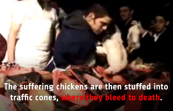 I was appalled to learn that tens of thousands of chickens are abused and killed each year on the eve of Yom Kippur in cruel Kapparot „atonement“ rituals, during which the birds are swung through the air by their wings before their throats are slit. Despite claims that the dead animals are given to feed the hungry, eyewitnesses say that some of the birds are tossed out like garbage!